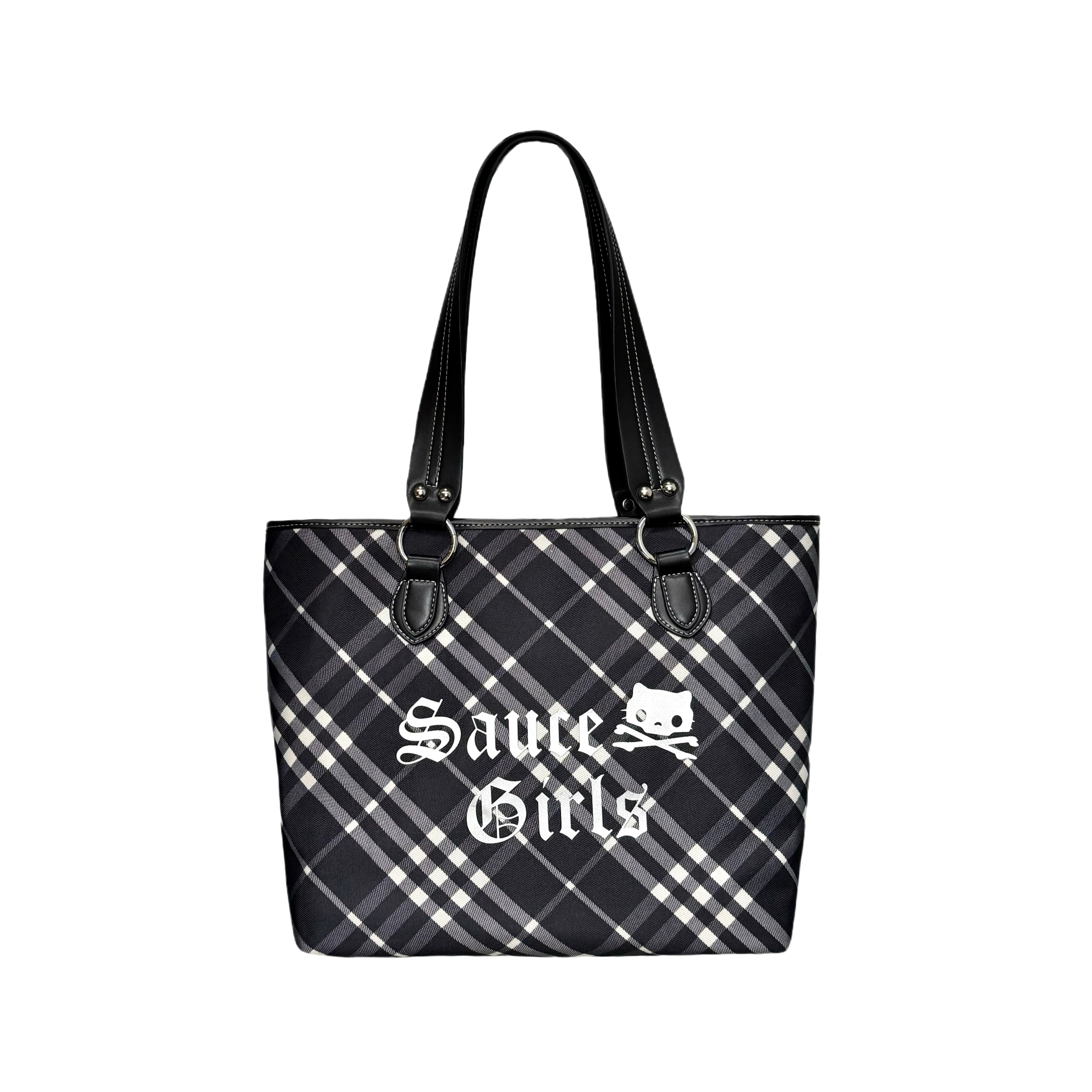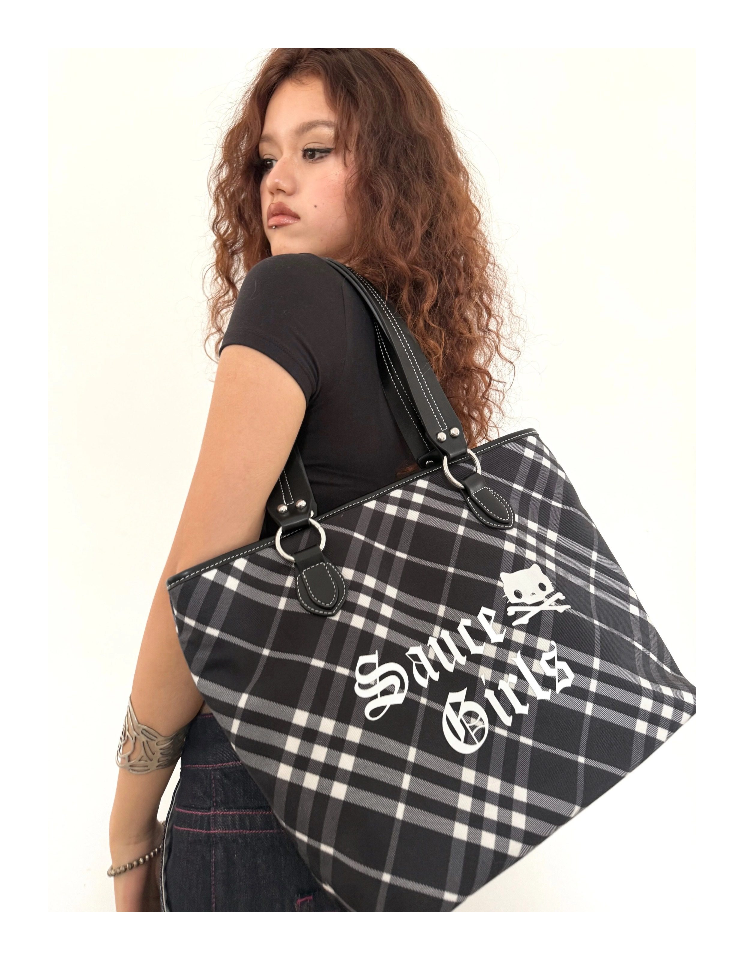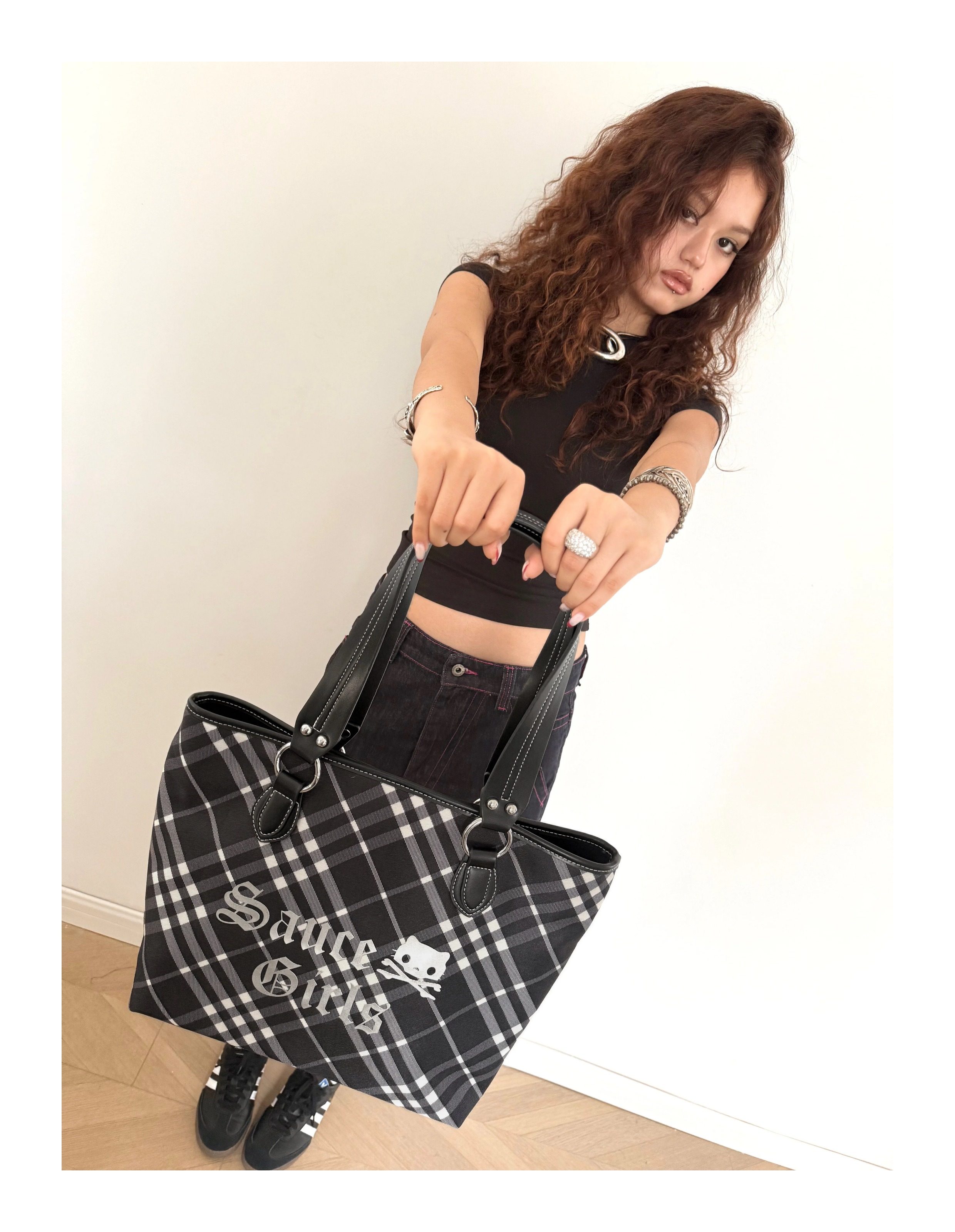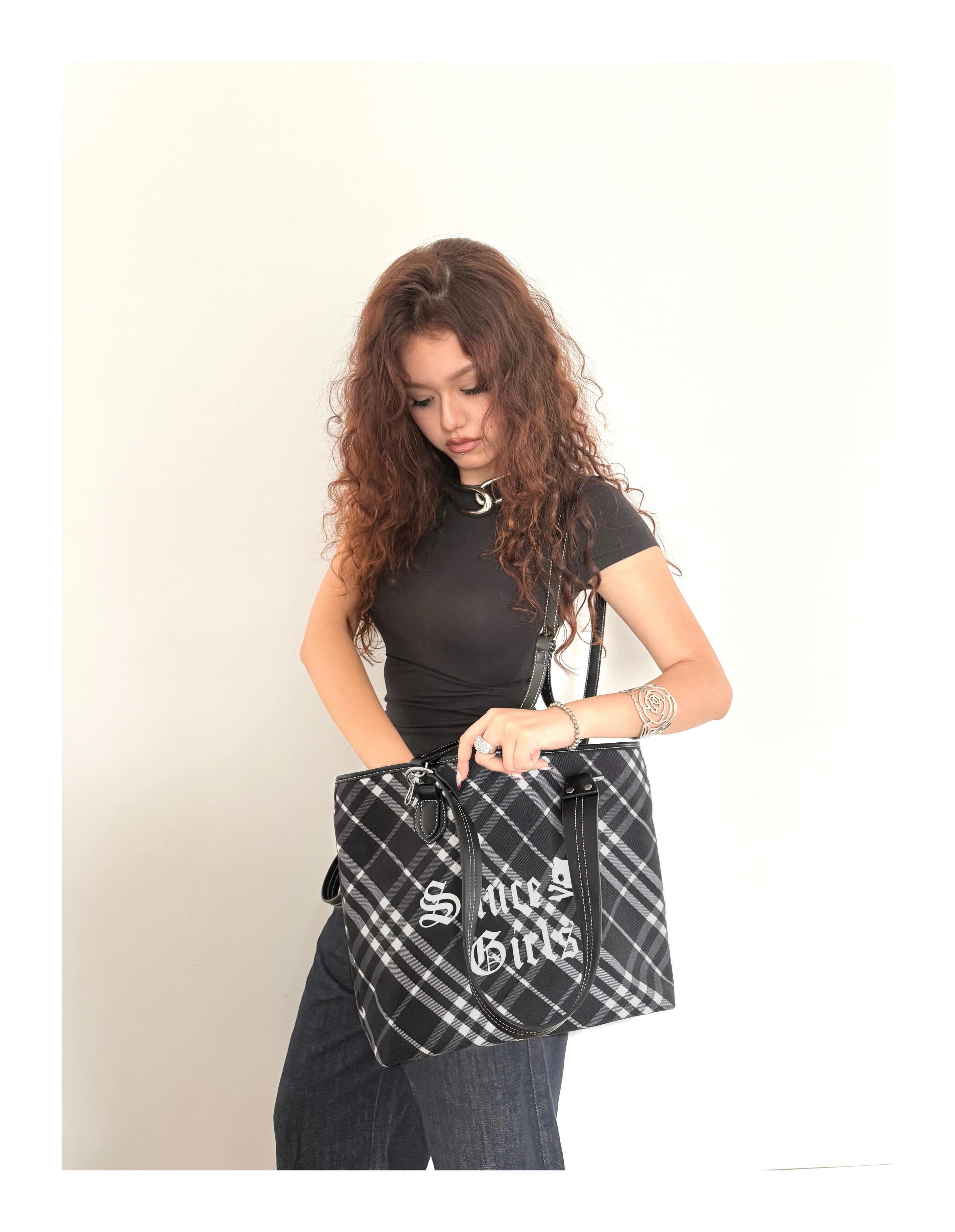 SAUCE Letter-printed Plaid Shoulder Commuter Tote Bag