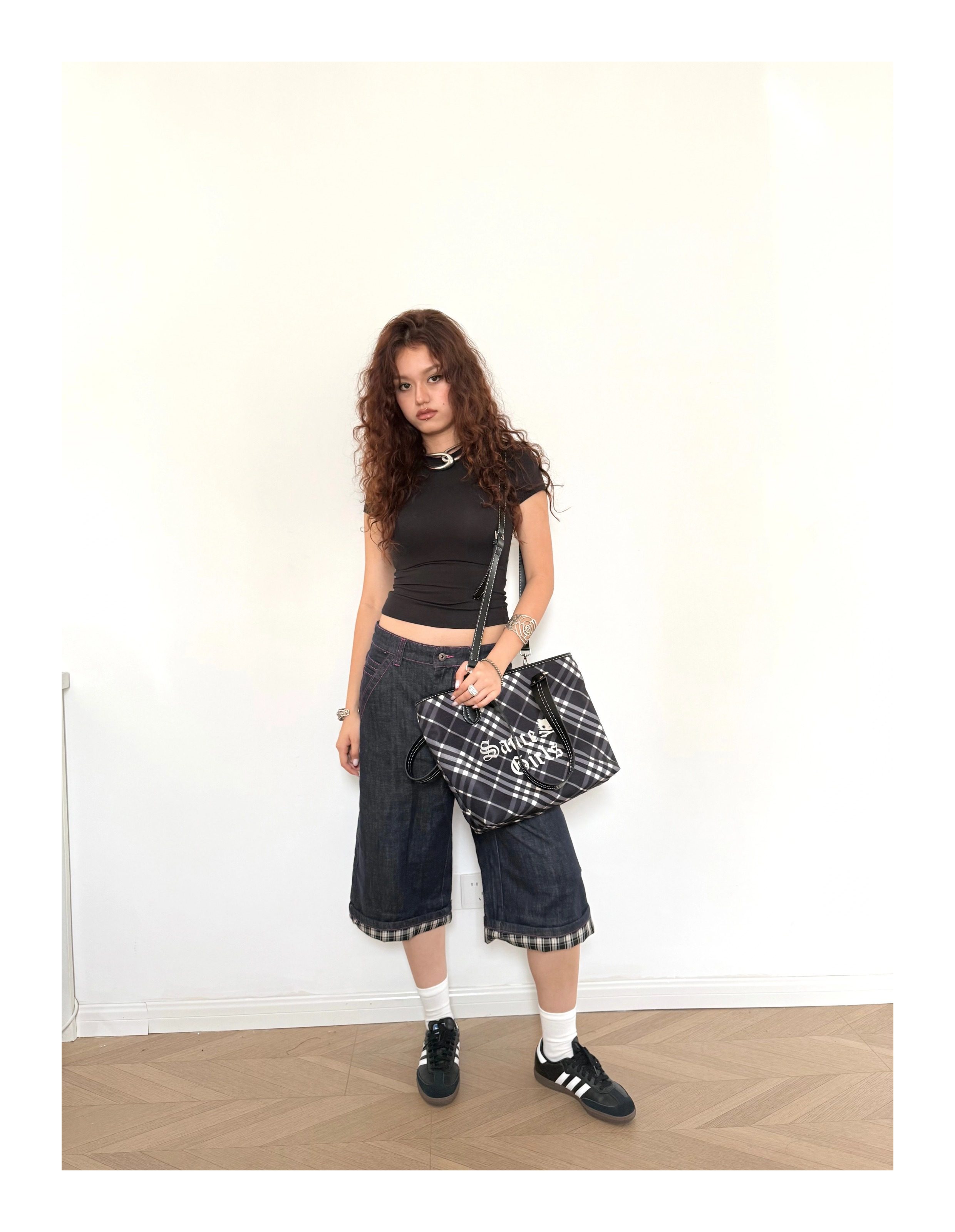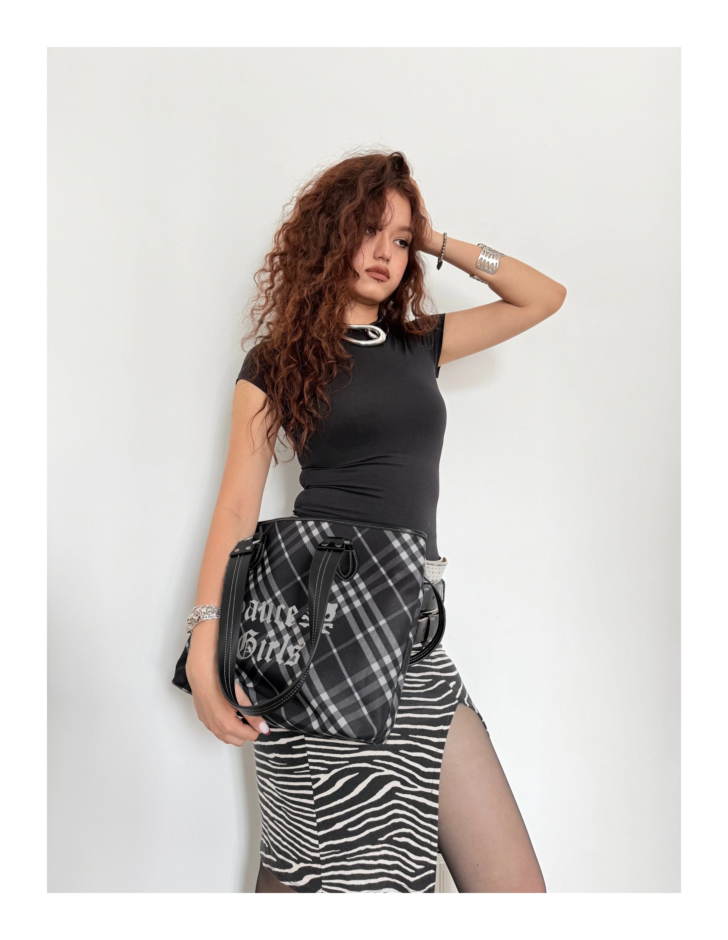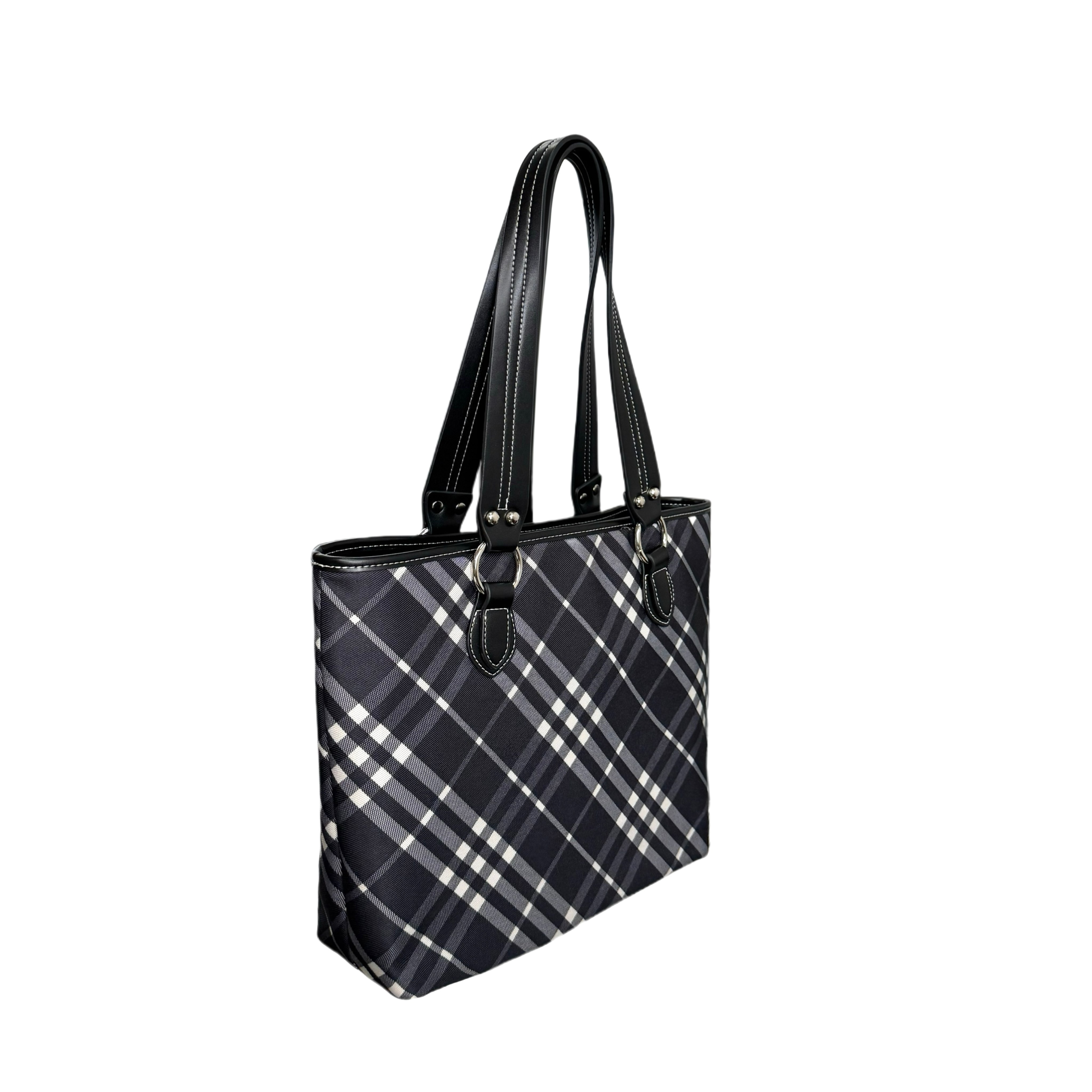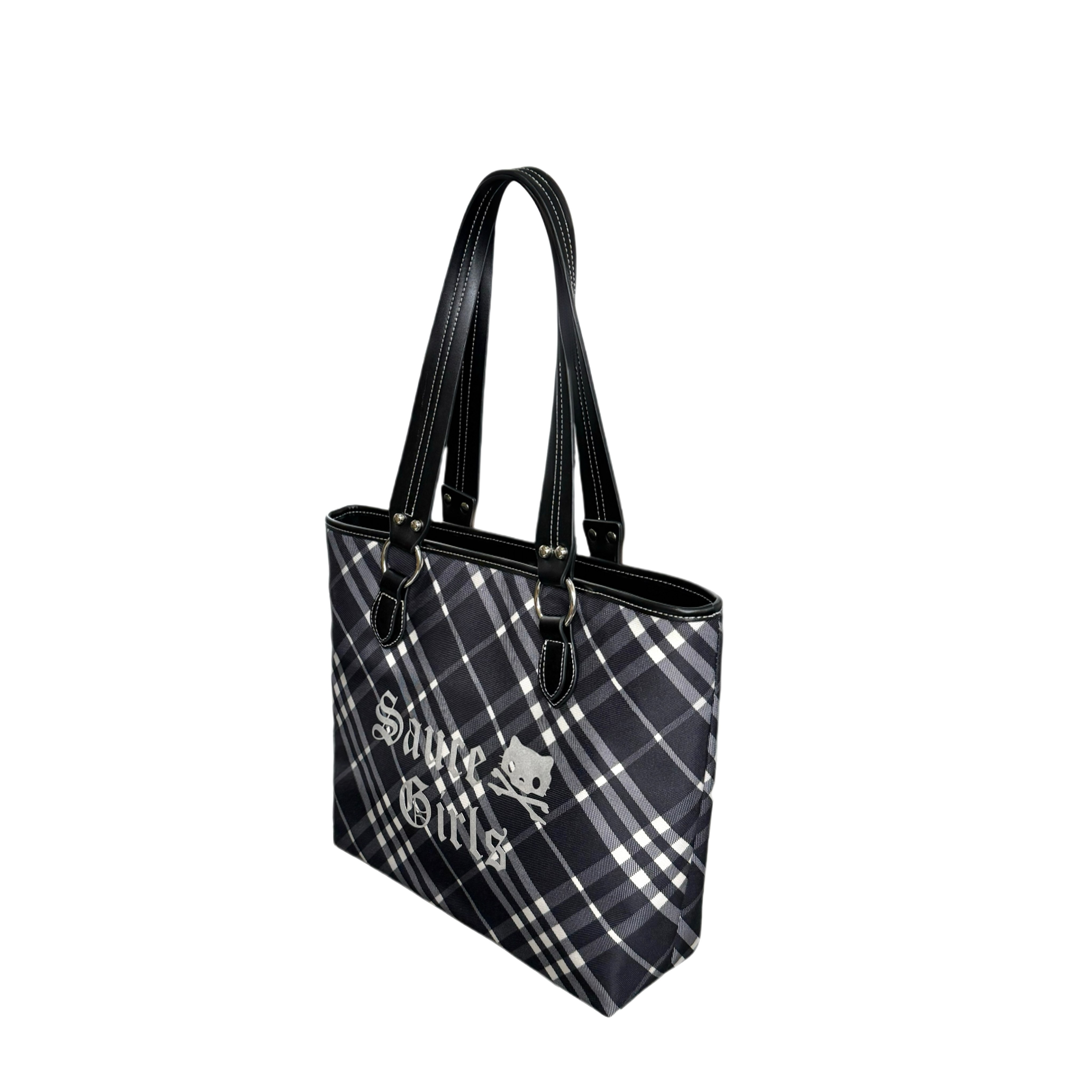 SAUCE Letter-printed Plaid Shoulder Commuter Tote Bag